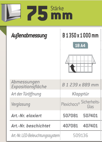 Außenabmessung B 1350 x 1000 mm - 18 A4 Abmessungen Expositionsfläche: B 1239 x 889 mm Art der Türöffnung: Klapptür Verglasung: Plexichocs® Art.-Nr. eloxiert: 507081 Art.-Nr. beschichtet: 407081 Verglasung: Sicherheitsglas Art.-Nr. eloxiert: 507401 Art.-Nr. beschichtet: 407401 Art.-Nr. LED-Beleuchtungssystem: 509136 . LINK zu Ständer-Sets Pfosten Ø 76 mm für Schaukästen "1000" und "2000" . LINK: Ständer-Sets Pfosten QUATRO für Schaukästen "1000" und "2000" und zusätzlichem Pfosten (plus) |