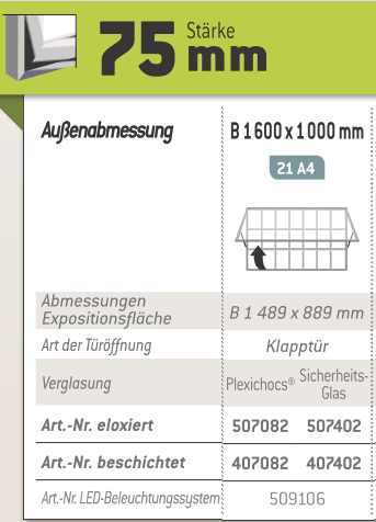 Außenabmessung B 1600 x 1000 mm - 21 A4 Abmessungen Expositionsfläche: B 1489 x 889 mm Art der Türöffnung: Klapptür Verglasung: Plexichocs® Art.-Nr. eloxiert: 507082 Art.-Nr. beschichtet: 407082 Verglasung: Sicherheitsglas Art.-Nr. eloxiert: 507402 Art.-Nr. beschichtet: 407402 Art.-Nr. LED-Beleuchtungssystem: 509106 . LINK zu Ständer-Sets Pfosten Ø 76 mm für Schaukästen "1000" und "2000" . LINK: Ständer-Sets Pfosten QUATRO für Schaukästen "1000" und "2000" und zusätzlichem Pfosten (plus) |