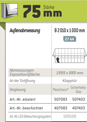 Außenabmessung B 2010 x 1000 mm - 27 A4 Abmessungen Expositionsfläche: B 1899 x 889 mm Art der Türöffnung: Klapptür Verglasung: Plexichocs® Art.-Nr. eloxiert: 507083 Art.-Nr. beschichtet: 407083 Verglasung: Sicherheitsglas Art.-Nr. eloxiert: 507403 Art.-Nr. beschichtet: 407403 Art.-Nr. LED-Beleuchtungssystem: 509109 . LINK zu Ständer-Sets Pfosten Ø 76 mm für Schaukästen "1000" und "2000" . LINK: Ständer-Sets Pfosten QUATRO für Schaukästen "1000" und "2000" und zusätzlichem Pfosten (plus) |