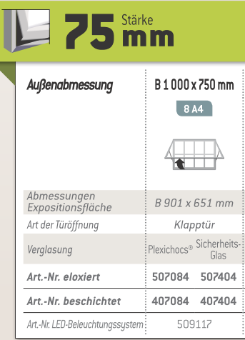 Außenabmessung B 1000 x 750 mm - 8 A4 Abmessungen Expositionsfläche: B 901 x 651 mm Art der Türöffnung: Klapptür Verglasung: Plexichocs® Art.-Nr. eloxiert: 507084 Art.-Nr. beschichtet: 407084 Verglasung: Sicherheitsglas Art.-Nr. eloxiert: 507404 Art.-Nr. beschichtet: 407404 Art.-Nr. LED-Beleuchtungssystem: 509117 . LINK zu Ständer-Sets Pfosten Ø 76 mm für Schaukästen "1000" und "2000" . LINK: Ständer-Sets Pfosten QUATRO für Schaukästen "1000" und "2000" und zusätzlichem Pfosten (plus) |