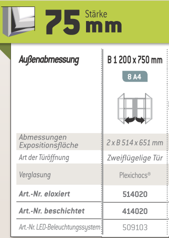 Außenabmessung B 1200 x 750 mm - 8 A4 Abmessungen Expositionsfläche: 2xB 514 x 651 mm Art der Türöffnung: Zweiflügelige Tür Verglasung: Plexichocs® Art.-Nr. eloxiert: 514020 Art.-Nr. beschichtet: 414020 Art.-Nr. LED-Beleuchtungssystem: 509103 . LINK zu Ständer-Sets Pfosten Ø 76 mm für Schaukästen "1000" und "2000" . LINK: Ständer-Sets Pfosten QUATRO für Schaukästen "1000" und "2000" und zusätzlichem Pfosten (plus) |