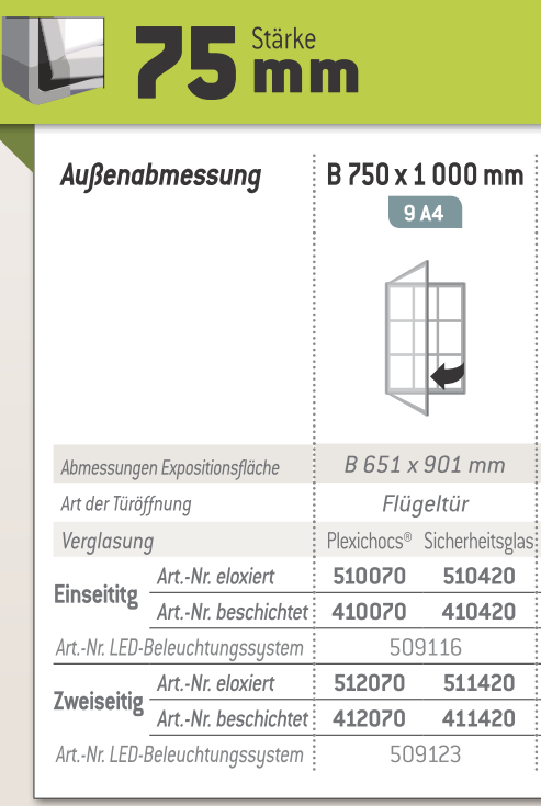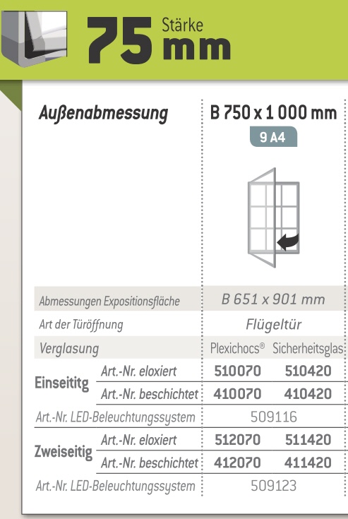 Außenabmessung B 750 x 1000 mm - 9 A4 Abmessungen Expositionsfläche: B 651 x 901 mm Art der Türöffnung: Flügeltür Verglasung: Plexichocs® - Einseitig Art.-Nr. eloxiert: 510070 Art.-Nr. beschichtet: 410070 Verglasung: Sicherheitsglas - Einseitig Art.-Nr. eloxiert: 510420 Art.-Nr. beschichtet: 410420 Art.-Nr. LED-Beleuchtungssystem: 509116 -------------------------------------------------------------- Verglasung: Plexichocs® - Zweiseitig Art.-Nr. eloxiert: 512070 Art.-Nr. beschichtet: 412070 Verglasung: Sicherheitsglas - Zweiseitig Art.-Nr. eloxiert: 511420 Art.-Nr. beschichtet: 411420 Art.-Nr. LED-Beleuchtungssystem: 509123 . LINK zu Ständer-Sets Pfosten Ø 76 mm für Schaukästen "1000" und "2000" . LINK: Ständer-Sets Pfosten QUATRO für Schaukästen "1000" und "2000" und zusätzlichem Pfosten (plus) |