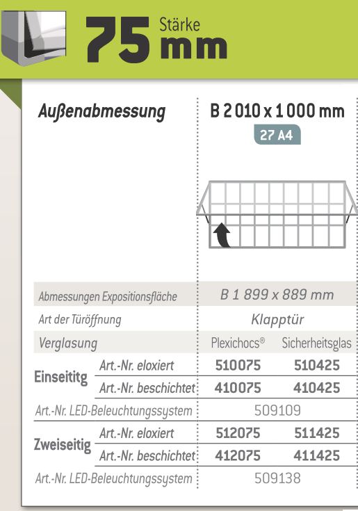 Außenabmessung B 2010 x 1000 mm - 27 A4 Abmessungen Expositionsfläche: B 1899 x 889 mm Art der Türöffnung: Klapptür Verglasung: Plexichocs® - Einseitig Art.-Nr. eloxiert: 510075 Art.-Nr. beschichtet: 410075 Verglasung: Sicherheitsglas - Einseitig Art.-Nr. eloxiert: 510425 Art.-Nr. beschichtet: 410425 Art.-Nr. LED-Beleuchtungssystem: 509109 -------------------------------------------------------------- Verglasung: Plexichocs® - Zweiseitig Art.-Nr. eloxiert: 512075 Art.-Nr. beschichtet: 412075 Verglasung: Sicherheitsglas - Zweiseitig Art.-Nr. eloxiert: 511425 Art.-Nr. beschichtet: 411425 Art.-Nr. LED-Beleuchtungssystem: 509138 . LINK zu Ständer-Sets Pfosten Ø 76 mm für Schaukästen "1000" und "2000" . LINK: Ständer-Sets Pfosten QUATRO für Schaukästen "1000" und "2000" und zusätzlichem Pfosten (plus) |