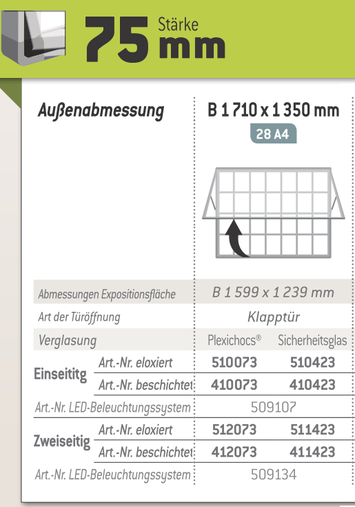 Außenabmessung B 1710 x 1350 mm - 28 A4 Abmessungen Expositionsfläche: B 1599 x 1239 mm Art der Türöffnung: Klapptür Verglasung: Plexichocs® - Einseitig Art.-Nr. eloxiert: 510073 Art.-Nr. beschichtet: 410073 Verglasung: Sicherheitsglas - Einseitig Art.-Nr. eloxiert: 510423 Art.-Nr. beschichtet: 410423 Art.-Nr. LED-Beleuchtungssystem: 509107 -------------------------------------------------------------- Verglasung: Plexichocs® - Zweiseitig Art.-Nr. eloxiert: 512073 Art.-Nr. beschichtet: 412073 Verglasung: Sicherheitsglas - Zweiseitig Art.-Nr. eloxiert: 511423 Art.-Nr. beschichtet: 411423 Art.-Nr. LED-Beleuchtungssystem: 509134 . LINK zu Ständer-Sets Pfosten Ø 76 mm für Schaukästen "1000" und "2000" . LINK: Ständer-Sets Pfosten QUATRO für Schaukästen "1000" und "2000" und zusätzlichem Pfosten (plus) |