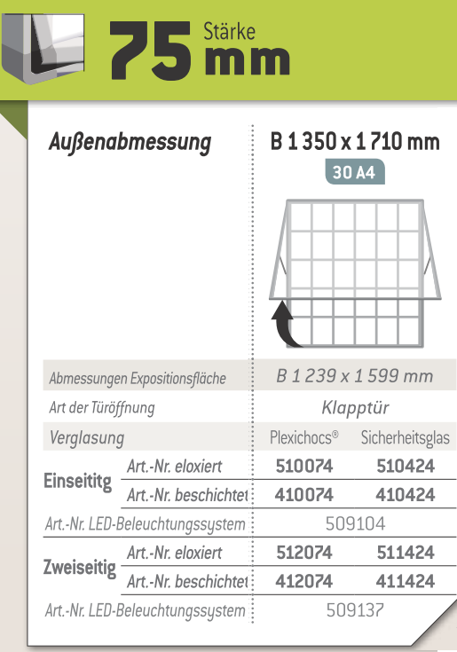 Außenabmessung B 1350 x 1710 mm - 30 A4 Abmessungen Expositionsfläche: B 1239 x 1599 mm Art der Türöffnung: Klapptür Verglasung: Plexichocs® - Einseitig Art.-Nr. eloxiert: 510074 Art.-Nr. beschichtet: 410074 Verglasung: Sicherheitsglas - Einseitig Art.-Nr. eloxiert: 510424 Art.-Nr. beschichtet: 410424 Art.-Nr. LED-Beleuchtungssystem: 509104 -------------------------------------------------------------- Verglasung: Plexichocs® - Zweiseitig Art.-Nr. eloxiert: 512074 Art.-Nr. beschichtet: 412074 Verglasung: Sicherheitsglas - Zweiseitig Art.-Nr. eloxiert: 511424 Art.-Nr. beschichtet: 411424 Art.-Nr. LED-Beleuchtungssystem: 509137 . LINK zu Ständer-Sets Pfosten Ø 76 mm für Schaukästen "1000" und "2000" . LINK: Ständer-Sets Pfosten QUATRO für Schaukästen "1000" und "2000" und zusätzlichem Pfosten (plus) |