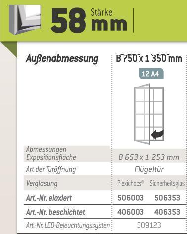 Außenabmessung B 750 x 1350 mm - 12 A4 Abmessungen Expositionsfläche: B 653 x 1253 mm Art der Türöffnung: Flügeltür Verglasung: Plexichocs® Art.-Nr. eloxiert: 506003 Art.-Nr. beschichtet: 406003 Verglasung: Sicherheitsglas Art.-Nr. eloxiert: 506353 Art.-Nr. beschichtet: 406353 Art.-Nr. LED-Beleuchtungssystem: 509123 . LINK: Ständer-Sets Pfosten 60x40 mm für Schaukästen "TRADITION" und "KLASSIK" und zusätzlichem Pfosten (plus) |