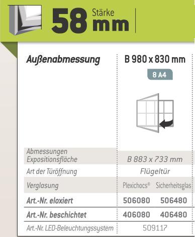 Außenabmessung B 980 x 830 mm - 8 A4 Abmessungen Expositionsfläche: B 883 x 733 mm Art der Türöffnung: Flügeltür Verglasung: Plexichocs® Art.-Nr. eloxiert: 506080 Art.-Nr. beschichtet: 406080 Verglasung: Sicherheitsglas Art.-Nr. eloxiert: 506480 Art.-Nr. beschichtet: 406480 Art.-Nr. LED-Beleuchtungssystem: 509117 . LINK: Ständer-Sets Pfosten 60x40 mm für Schaukästen "TRADITION" und "KLASSIK" und zusätzlichem Pfosten (plus) |