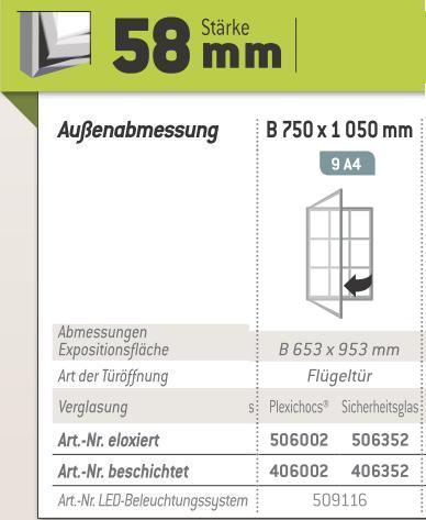 Außenabmessung B 750 x 1050 mm - 9 A4 Abmessungen Expositionsfläche: B 653 x 953 mm Art der Türöffnung: Flügeltür Verglasung: Plexichocs® Art.-Nr. eloxiert: 506002 Art.-Nr. beschichtet: 406002 Verglasung: Sicherheitsglas Art.-Nr. eloxiert: 506352 Art.-Nr. beschichtet: 406352 Art.-Nr. LED-Beleuchtungssystem: 509116 . LINK: Ständer-Sets Pfosten 60x40 mm für Schaukästen "TRADITION" und "KLASSIK" und zusätzlichem Pfosten (plus) |