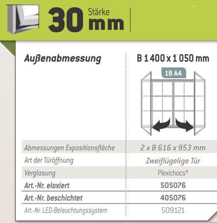 Außenabmessung B 1400 x 1050 mm - 18 A4 Abmessungen Expositionsfläche: 2 x B 616 x 953 mm Art der Türöffnung: Zweiflügelige Tür Verglasung: Plexichocs® Art.-Nr. eloxiert: 505076 Art.-Nr. beschichtet: 405076 Art.-Nr. LED-Beleuchtungssystem: 509121 . LINK: Ständer-Sets Pfosten 60x40 mm für Schaukästen "TRADITION" und "KLASSIK" und zusätzlichem Pfosten (plus) |