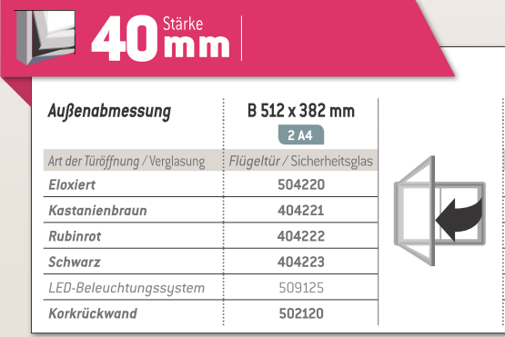 Außenabmessung B 512 x 382 mm - 2 A4 Art der Türöffnung/Verglasung: Flügeltür / Sicherheitsglas Art.-Nr. eloxiert: 504220 Art.-Nr. Kastanienbraun: 404221 Art.-Nr. Rubinrot: 404222 Art.-Nr. Schwarz: 404223 Art.-Nr. LED-Beleuchtungssystem: 509125 Korkrückwand (optional): Art.-Nr.: 502120 |