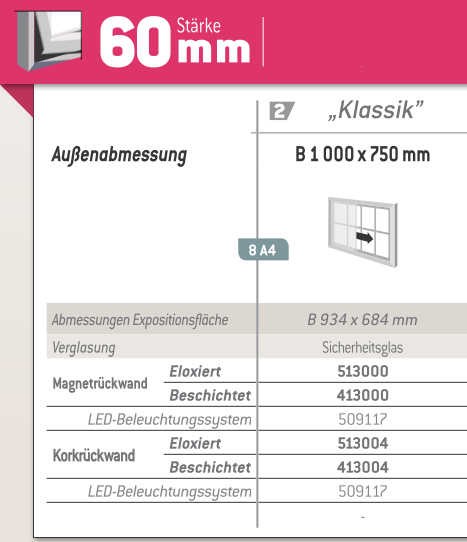 "KLASSIK" Außenabmessung B 1000 x 750 mm - 8 A4 Abmessungen Expositionsfläche: B 934 x 684 mm Art der Türöffnung/Verglasung: Schiebetür / Sicherheitsglas Magnetrückwand: Art.-Nr. eloxiert: 51300 Art.-Nr. beschichtet: 413000 Art.-Nr. LED-Beleuchtungssystem: 509117 Korkrückwand: Art.-Nr. eloxiert: 513004 Art.-Nr. beschichtet: 413004 Art.-Nr. LED-Beleuchtungssystem: 509117 |